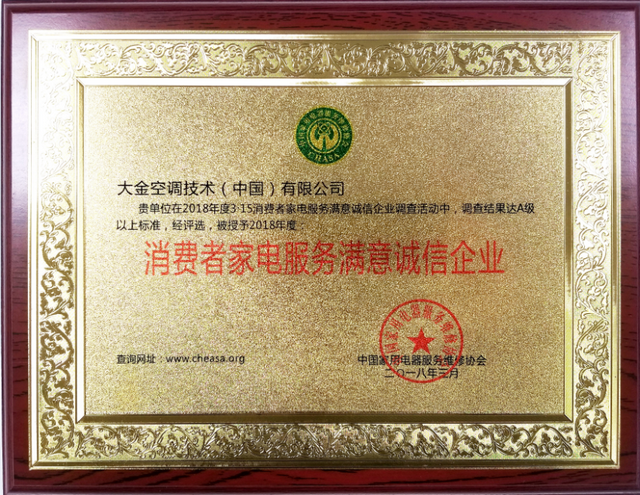 大金空调荣获2018年度 “消费者家电服务满意诚信企业”“消...